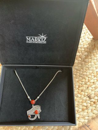 Elegante colgante con cadena de plata maciza, inspirado en el Ojo de Horus. Presenta detalles intrincados y gemas de coral. La marca Markiz es un referente en joyería de plata. - Diseño del Ojo de Horus. - Cadena de plata maciza. - Abalorios de coral.