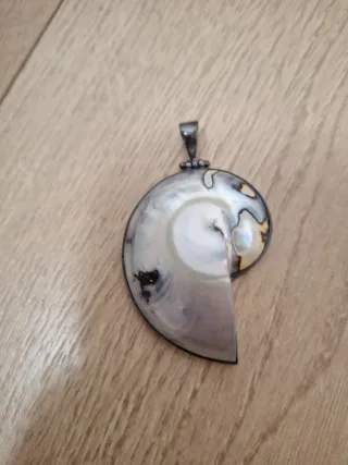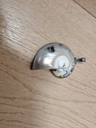 Colgante vintage con un diseño inspirado en una concha de nácar. La pieza tiene un acabado plateado y detalles iridiscentes. - Material: Nácar y metal. - Diseño: Forma de espiral. - Estilo: Vintage.