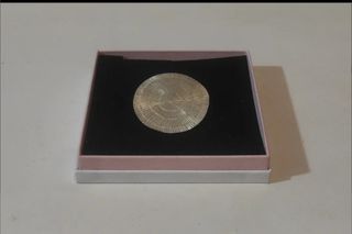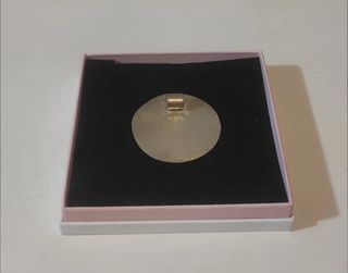 Colgante con un diseño inspirado en el estilo modernista. - Detalle de figura humana con brazos extendidos. - Marco circular con patrón de red. - Acabado metálico ( latón, bronce??) -Solo se realizan envios.