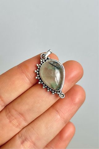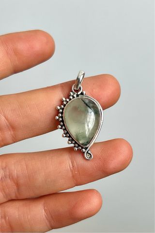COLGANTE DE PREHNITA VERDE – PLATA DE LEY 925 Precioso colgante con un cabujón de prehnita verde natural, conocida por su tonalidad suave y luminosa que transmite serenidad. La gema está cuidadosamente engastada en Plata de Ley 925. 📏 Medida del cabujón: 1,7 x 1,3 cm 📏 Medida del colgante completo con engarce: 3,4 x 1,8 cm 🎁 Incluye de regalo un cordón negro clásico para que puedas usarlo al instante. ✨ Propiedades: • Piedra de paz interior y conexión con el corazón • Potencia la intuición y la percepción sutil • Excelente para equilibrar emociones y reducir la ansiedad • Perfecta para terapeutas y sanadores