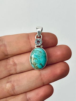 Colgante con una Turquesa de Arizona y un pequeño topacio facetado engastado en Plata de Ley 925. • Medida cabujón turquesa: 1,6 x 1,2cm. • Medida colgante completo con engarce: 3,4 x 1,4cm. 🎁 Incluye de regalo un cordón negro clásico. Amuleto de protección ancestral usado por chamanes y guerreros. Favorece la sanación emocional, la comunicación y la confianza. Piedra que transmite paz y bienestar.