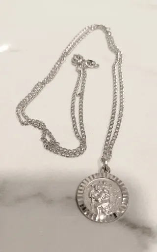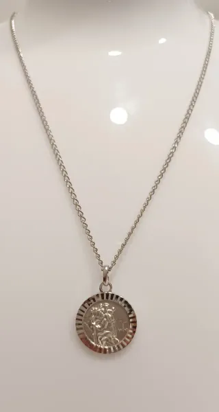 Conjunto de cadena y colgante con la imagen de San Cristóbal. - Cadena larga 50 cm. - Colgante redondo con borde texturizado. - Diseño de San Cristóbal portando un bastón. - Cadena de eslabones finos. Plata rodiada.