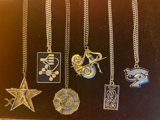 Conjunto de tres colgantes con diseños únicos. - Colgante Iluminado con ojo y estrella. - Colgante Longevo con símbolo de protección. - Colgante Fortunado con diversos símbolos. - Con cadenas , el folleto explicativo y funda de plàstico para cada una. Se venden juntas por 10€ y separadas por 4€