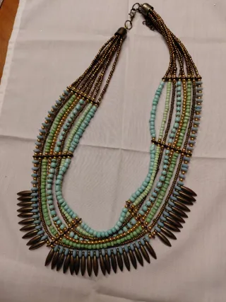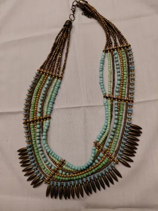Elegante collar étnico con un diseño de multicapa y detalles metálicos. - Tonos verdes y azules vibrantes. - Cuentas pequeñas y detalles dorados. - Colgantes metálicos en forma de lágrima.