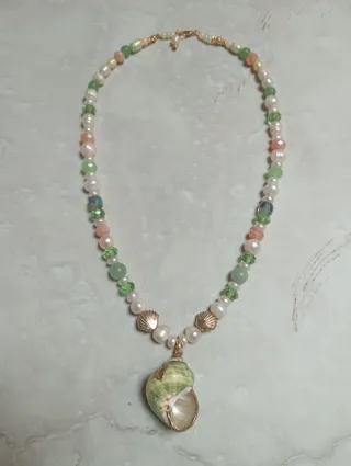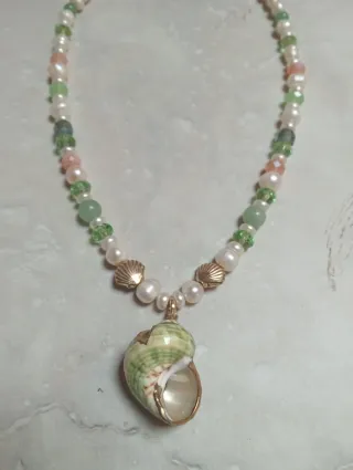 Collar artesanal con perlas naturales, de botón y semi-barrocas, con lustre rosado, cuentas de jade y cristales facetados. - Colgante de caracola, trabajada y tonos dorados. - Cierre de mosquetón dorado. - Diseño único.