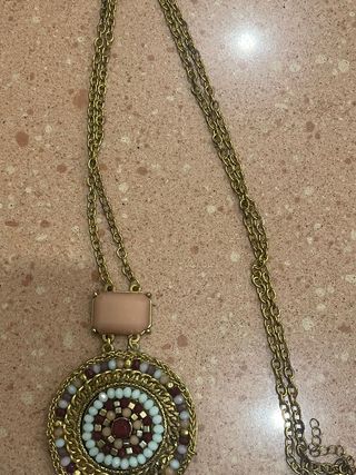 Elegante collar con cadena dorada y un llamativo colgante circular adornado con pequeñas piedras en tonos rosados, blancos y burdeos. El colgante está coronado por una piedra rectangular de color rosa pálido. - Diseño circular con detalles de pedrería. - Cadena de eslabones dorados.