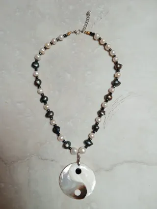 Elegante collar con perlas naturales semi-barrocas, blancas y negras de botón y un colgante con el símbolo Yin-Yang, de concha de abulón y nácar. - Perlas negras y blancas naturales, semi-barrocas y de botón. - Colgante redondo con diseño Yin-Yang, de conch de abulón.