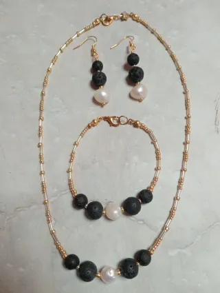 Elegante conjunto de bisutería artesanal. - Collar con cuentas de lava volcánica y perlas barrocas - Pulsera a juego con cuentas de lava y perlas. - Pendientes colgantes con cuentas de lava y perlas. - Cierres de mosquetón metálico y anzuelo.