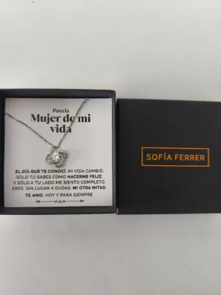 Colgante de la marca Sofía Ferrer con un diseño de nudo de amor, ideal para regalar. Un detalle inolvidable. - Mensaje Para la Mujer de mi vida incluido. - El mensaje expresa El día que te conocí, mi vida cambió. Sólo tú sabes cómo hacerme feliz. Y sólo a tu lado me siento completo eres, sin lugar a dudas, mi otra mitad. Te amo, hoy y para siempre.