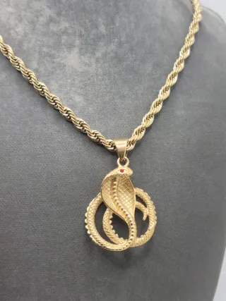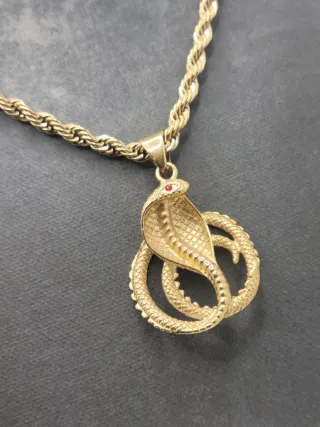 Elegante colgante con diseño de serpiente, chapado en oro. Un accesorio llamativo con un toque de distinción. - Material: Acero quirúrgico. - Acabado: Chapado en oro. - Detalle: Ojos en color rojo. - Cordón rizado incluido