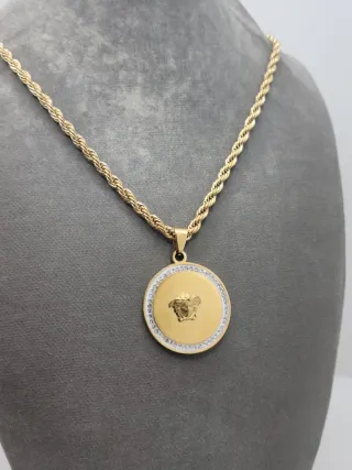 Elegante colgante con diseño Medusa. - Acero quirúrgico chapado en oro. - Colgante circular con detalle Medusa. - Borde adornado con pequeñas piedras brillantes. - Cordón tipo cadena trenzada.