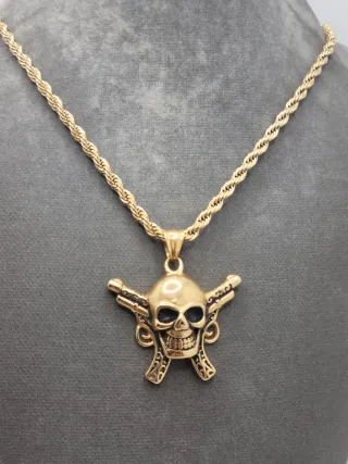 Colgante con diseño de calavera y pistolas cruzadas. Fabricado en acero quirúrgico con un acabado chapado en oro. - Diseño llamativo de calavera. - Detalles de pistolas cruzadas. - Material: Acero quirúrgico.