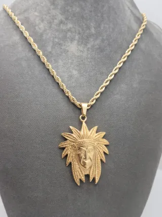 Colgante con diseño de cabeza de indio, fabricado en acero quirúrgico y chapado en oro. -Cordón rizado incluido. - Diseño detallado de rostro con tocado. - Acabado brillante.