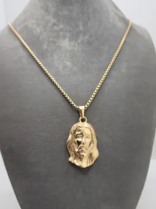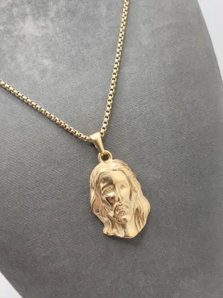 Colgante con la figura de Jesucristo. - Diseño detallado del rostro. - Acero quirúrgico chapado en oro. - Cadena redondeada incluida.