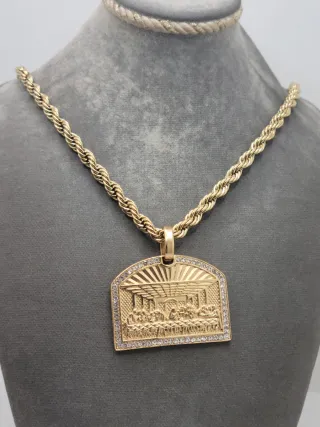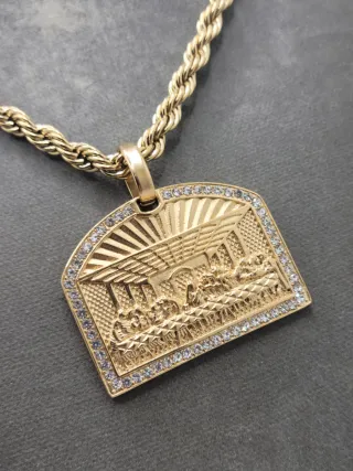 Este colgante presenta una detallada representación de La Última Cena enmarcada en un diseño con acabado dorado. La cadena de cordón rizado complementa el colgante, creando un conjunto llamativo. - Acero quirúrgico chapado en oro. - Colgante con diseño de La Última Cena. - Cadena de cordón rizado. - Acabado dorado.