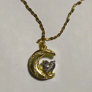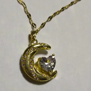 Precioso colgante de acero inoxidable, no se pone feo, con diseño de luna y corazón, ideal para regalarle la luna a tu pareja este San Valentín, día de los enamorados - Acabado en tono dorado. - Detalle de pequeñas circonitas incrustadas en la luna. - Corazón central con talla brillante. - Cadena incluida - Nuevo sin estrenar Día de la madre, dije