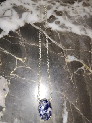 Colgante con piedra Sodalita natural engastada en plata de ley 925. - Diseño ovalado. - Cadena de plata incluida. - Detalle trenzado en el engaste. Se vende tal y cómo se ve en las fotografías. 75€ envío incluido correos certificado