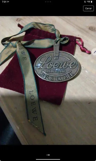 Detalle de la marca Loewe con su cinta. - Colgante metálico con el logo de Loewe. - Cinta decorativa con el nombre de la marca.