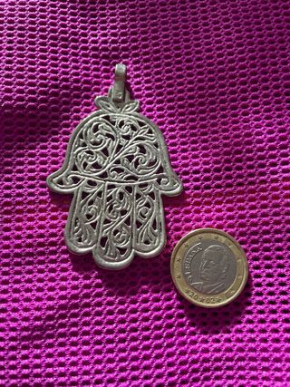 Colgante con diseño de la Mano de Fátima, también conocida como Hamsa. Es un accesorio decorativo con un intrincado patrón calado. - Diseño calado detallado. - Forma de mano. - Cierre para colgar.