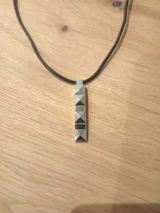 Colgante con cadena de cuero negro y detalle metálico plateado. - Diseño moderno y elegante. - Cierre de seguridad.