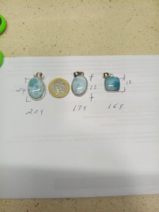 colgantes de piedra Larimar con engaste de plata. - Colgante ovalado de Larimar con precio de 20,0 Eur. -Colgante ovalado de Larimar con precio de 17,0 Eur. - Colgante cuadrado de Larimar con precio de 16,0 Eur.