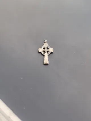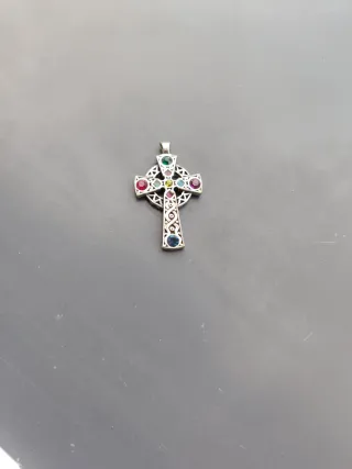 Este colgante presenta un diseño de cruz celta con detalles intrincados. - Elaborado en metal plateado. - Adornado con pequeñas piedras de colores.
