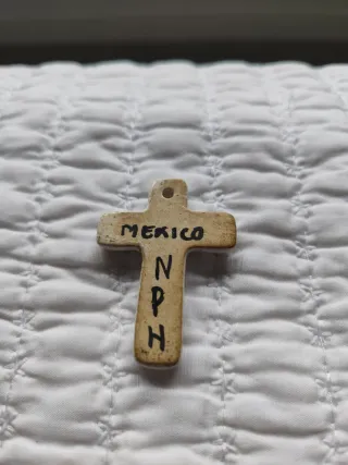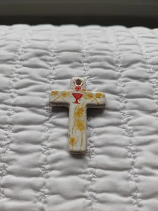 Pequeña cruz de cerámica decorada con motivos religiosos. - Diseño con cáliz y espigas. - Colgante con agujero para cordón. Es de México.