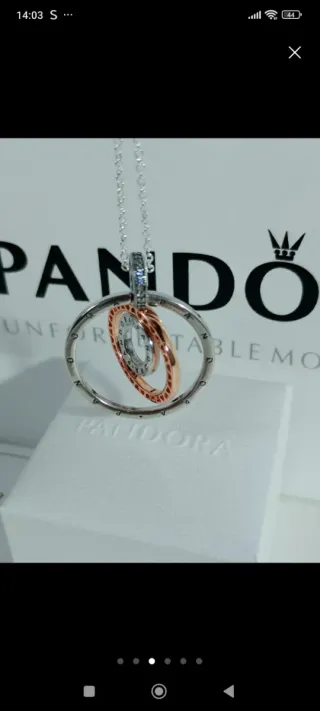 Elegante colgante de la marca Pandora con un diseño de círculos entrelazados. - Combina tonos dorados y plateados. - Detalles de circonitas brillantes en dos de los aros.Precioso,con su caja y bolsa