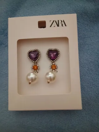 Pendientes de la marca Zara con un diseño encantador. - Detalle de corazón morado con circonitas. - Colgante de perla grande. - Adorno floral con detalles naranjas.