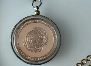 Medalla conmemorativa de las Naciones Unidas. - Diseño circular con el emblema de la ONU. - Cadena metálica dorada para colgar.