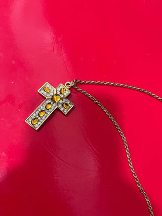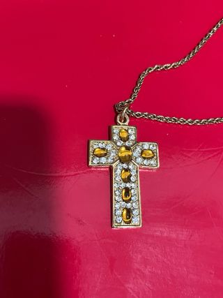 Elegante collar con un colgante en forma de cruz adornado con piedras. Incluye una cadena a juego. - Diseño de cruz con incrustaciones. - Cadena de eslabones finos.