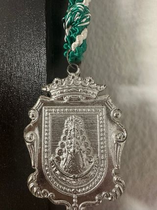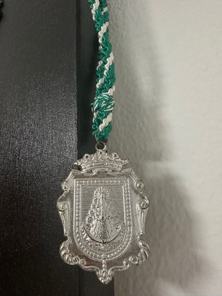 Medalla Rociera con un cordón trenzado. - Diseño de escudo con figura religiosa. - Cordón con trenzado verde y blanco