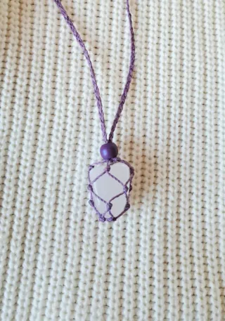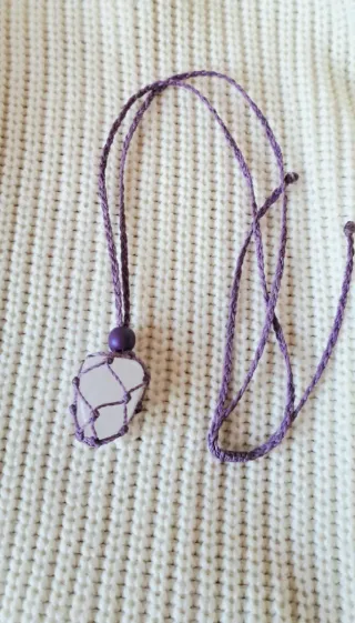 Colgante artesanal de cuarzo blanco natural hecho a mano con Amor y respeto en macramé color lila/morado. Pieza única, hecha con dedicación y energía positiva. Características: - Cuarzo blanco natural: conocido como el maestro sanador, aporta claridad, armonía y protección energética. - Macramé lila/morado: transmite espiritualidad, calma y conexión interior. - Nudo corredizo ajustable: adapta la altura a tu estilo y comodidad. Un colgante / amuleto lleno de energía positiva, ideal para tu día a día o como regalo con significado. Se entrega en cajita de regalo
