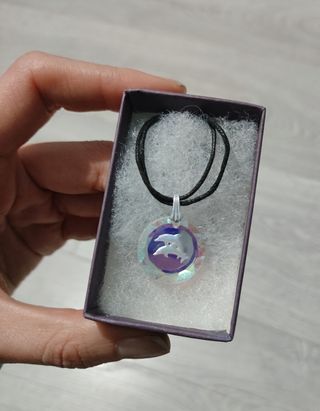 Colgante efecto espejo multicolor según la luz. Con detalle de dos delfines. Y doble cordón. Caja incluida.