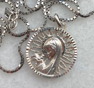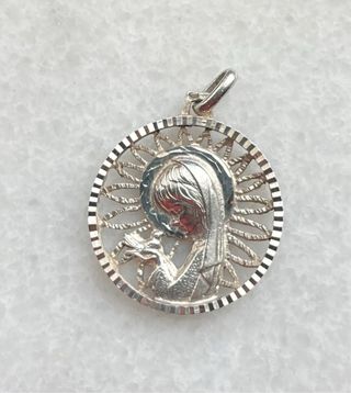 Colgante religioso con diseño detallado. - Elaborado en plata de ley. - Representación de figura religiosa. Virgen.