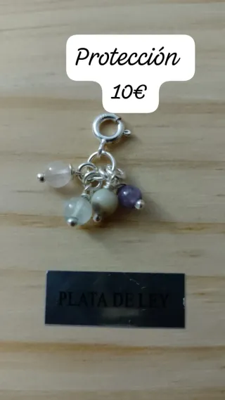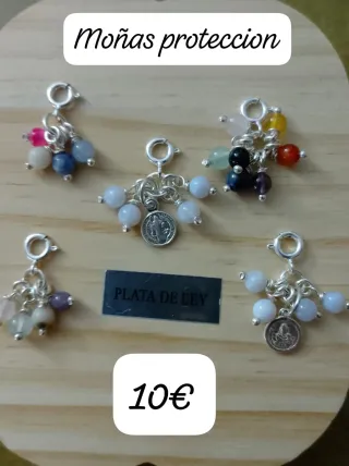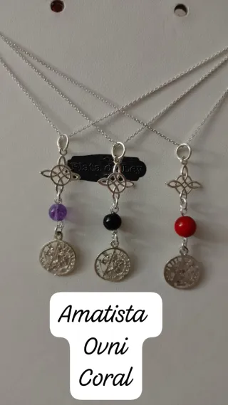 Colgante de plata de ley con varias piedras semipreciosas. Incluye un charm con la imagen de San Benito. Precio unidad de moña - Cierre de mosquetón. - Diseño artesanal.