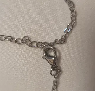 Elegante collar con un diseño moderno y llamativo. - Cadena de malla plateada. - Nudo central decorativo. - Colgantes de diferentes tamaños y formas.