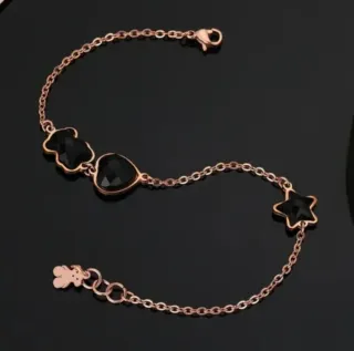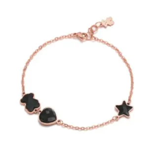 Elegante pulsera de la marca TOUS con un diseño delicado. - Cadena fina en tono oro rosa. - Colgantes: un oso, un corazón facetado y una estrella. - Detalles en negro.