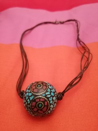 Colgante tribal esférico. Tonos negros, azules, granates y dorados. Cordón de cuero.