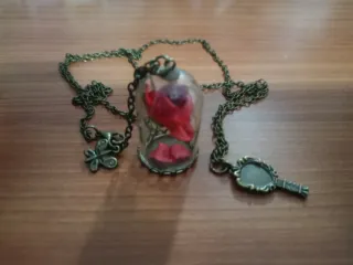 Colgante inspirado en la Bella y la Bestia con una rosa dentro de una campana de cristal. - Diseño detallado de rosa roja. - Incluye un pequeño espejo y una mariposa como adornos. - Cadena de estilo vintage.