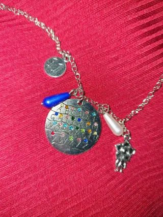 Colgante inspirado en Stranger Things con un diseño circular y varios adornos. - Colgante principal con letras y abalorios de colores. - Adorno de perla. - Figura pequeña. - Moneda con grabado.