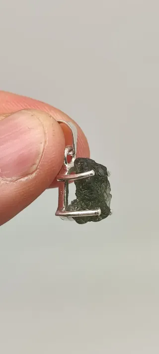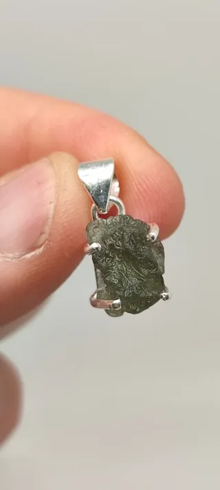 Bonito colgante de plata de ley 925 y moldavita. Medida 2×0,9 cm con el engarce. Se entrega con bolsita para regalo.