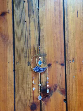 Precioso colgante con diseño de luna y amatistas. Ideal para decorar. - Adornado con amatistas. - Detalles en cristales facetados. - Elementos colgantes con forma de estrella y rombo. - Colgante de cristal grande en la parte inferior.