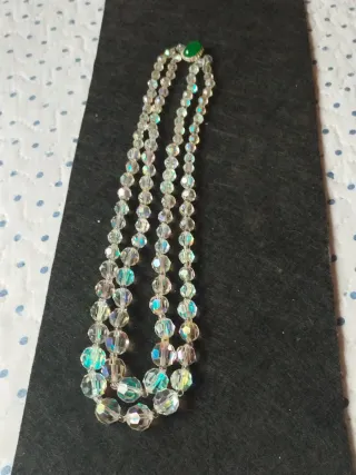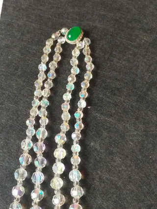 Elegante collar de cristal con un diseño de dos hileras. El colgante central añade un toque de color. Más en mi perfil - Cristales transparentes facetados. - Colgante central de piedra verde. - Cierre plateado.