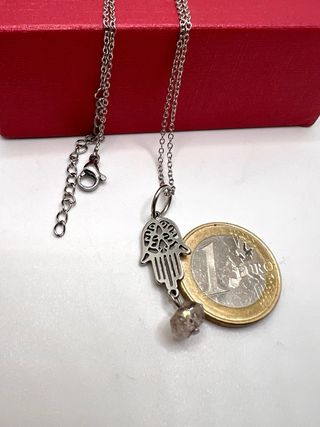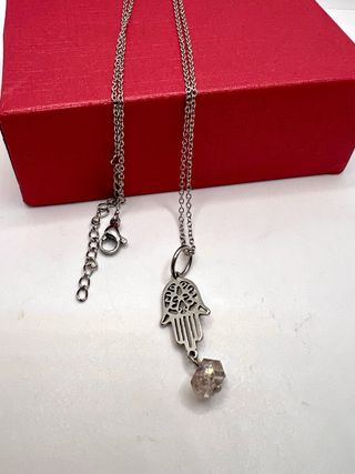 Colgante con diseño de la Mano de Fátima acero inoxidable con mineral y cadena acero inoxidable. 1-Herkimer 2-Shungita 3- Ámbar 4-Ojo de tigre 5- Jaspe Leopardo Precio por unidad .