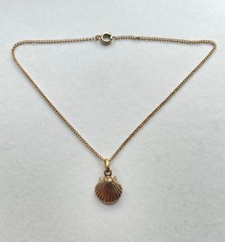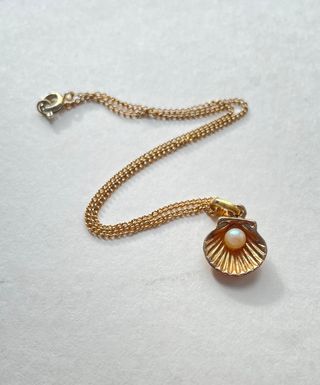 Elegante colgante dorado con un diseño de concha marina y una perla en su interior. La cadena es dorada y delicada. - Colgante con forma de concha. - Detalle de perla central. medalla colgante cadena collar cruz oro plata dorado plateado arte religioso santo virgen cristo