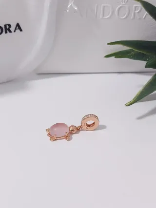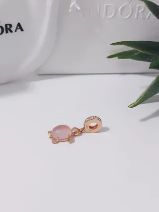Este encantador colgante de Pandora presenta un diseño de tortuga con una piedra rosa. - Detalle de circonitas cúbicas en el colgante. - Cierre con el logo de Pandora. - Fabricado en plata de ley 925 con baño de oro rosa de 14k.