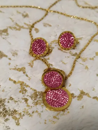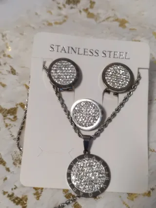 Elegante conjunto de bisutería de acero inoxidable. - Incluye collar con colgante y par de pendientes. - Diseño circular con incrustaciones brillantes. - Cierre de cadena para el collar.