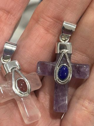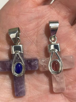 Set de dos colgantes con forma de cruz, uno de cuarzo rosa y otro de amatista. Cada colgante tiene una piedra central ovalada. 15 euros por Ud - Colgante de cuarzo rosa con piedra central rojiza. - Colgante de amatista con piedra central azul. cuarzo azul