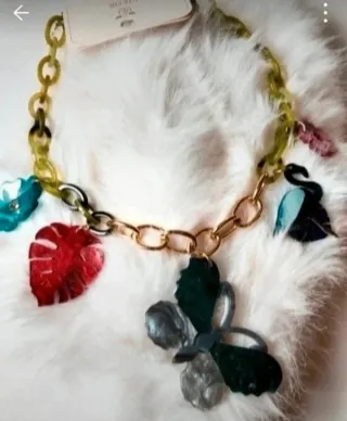 Collar con un diseño único y llamativo, con un colgante principal en forma de mariposa. #collarmariposa #collarresina #regalonavidad #pararegalar - Cadena dorada con eslabones grandes. - Colgantes variados: hojas tropicales y mariposas. - Detalles en tonos verdes, rojos, azules y plateados.